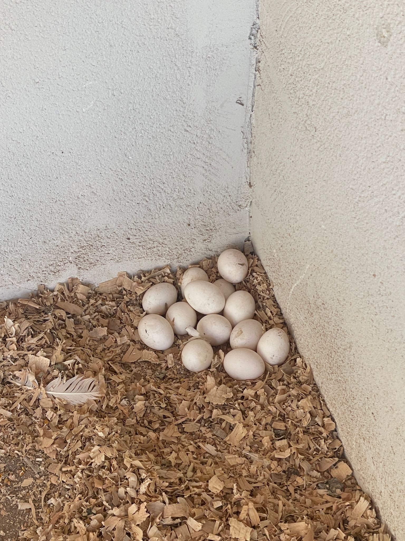 The pile of white eggs on the bottom were found in a corner of our yard. We don’t know how long a chicken(s) was laying the eggs outside of the coop but we now do frequent sweeps through the yard to look for random eggs!